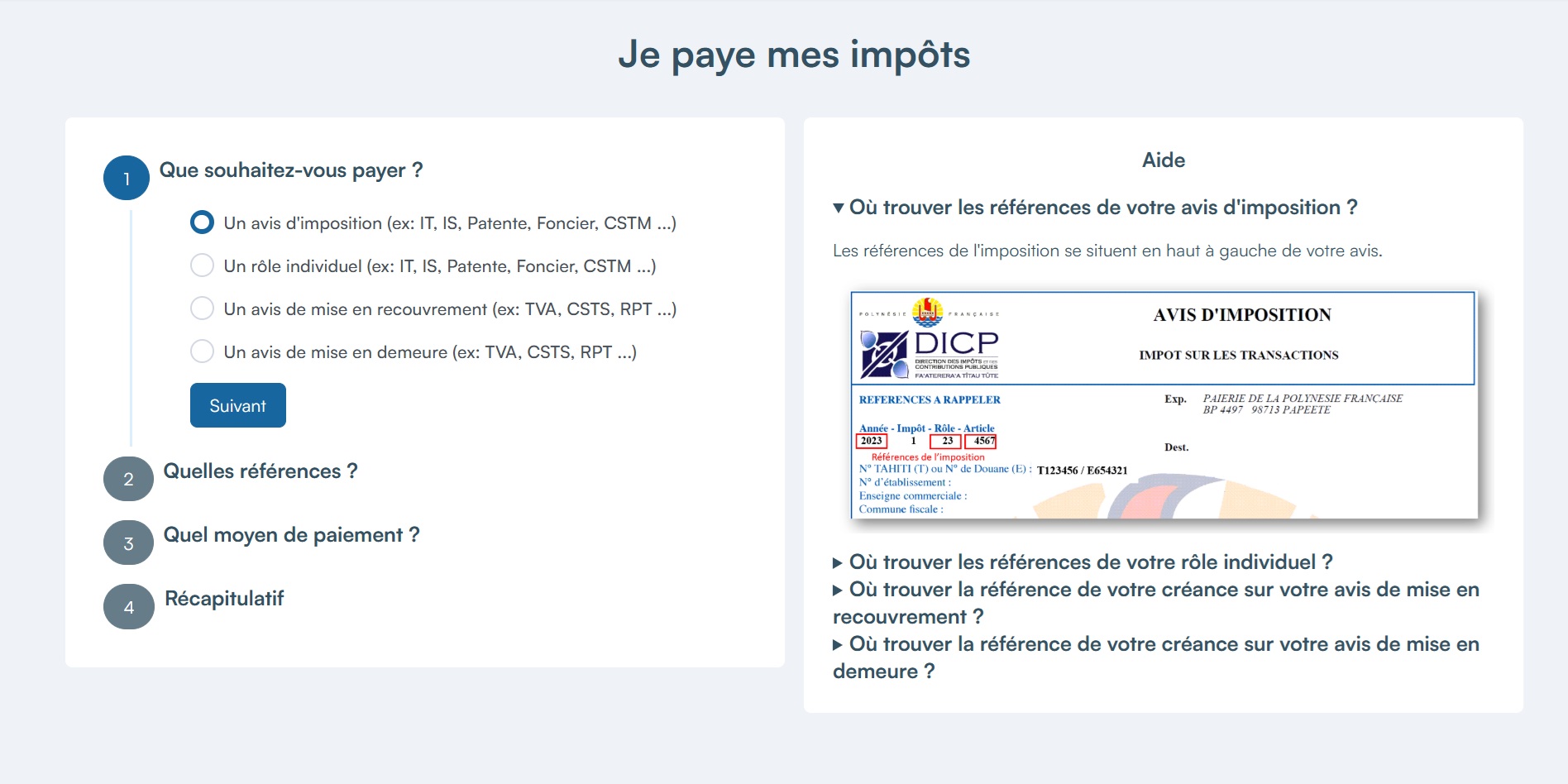 Les contribuables peuvent désormais régler à distance, par carte bancaire, leurs avis d’imposition, avis de mise en recouvrement, TVA et CSTS télédéclarées, ainsi que diverses créances fiscales. Ce mode de paiement sécurisé simplifie leurs démarches. Il est accessible sans inscription préalable via mesimpots.gov.pf/payer, mais également en mode connecté, offrant ainsi un pré-remplissage automatique des informations de paiement.